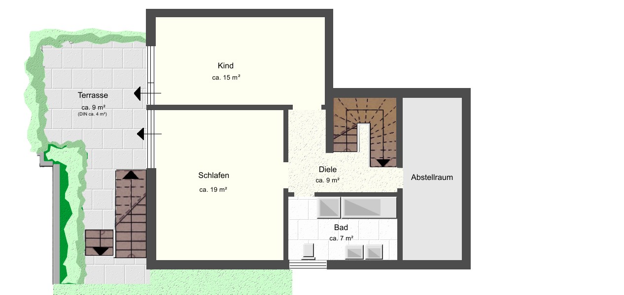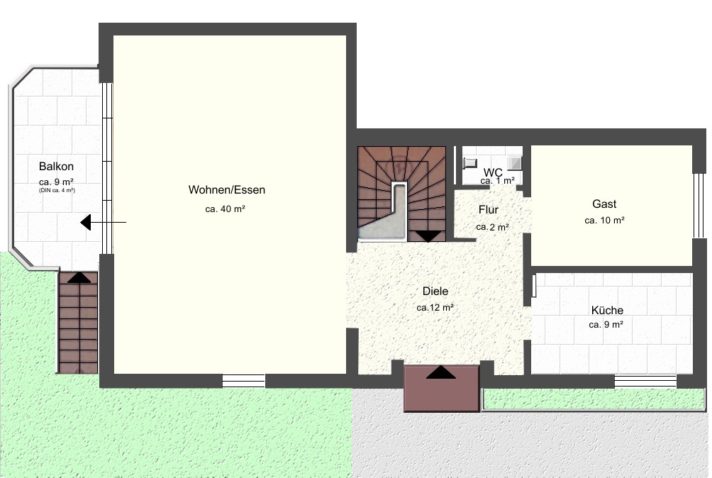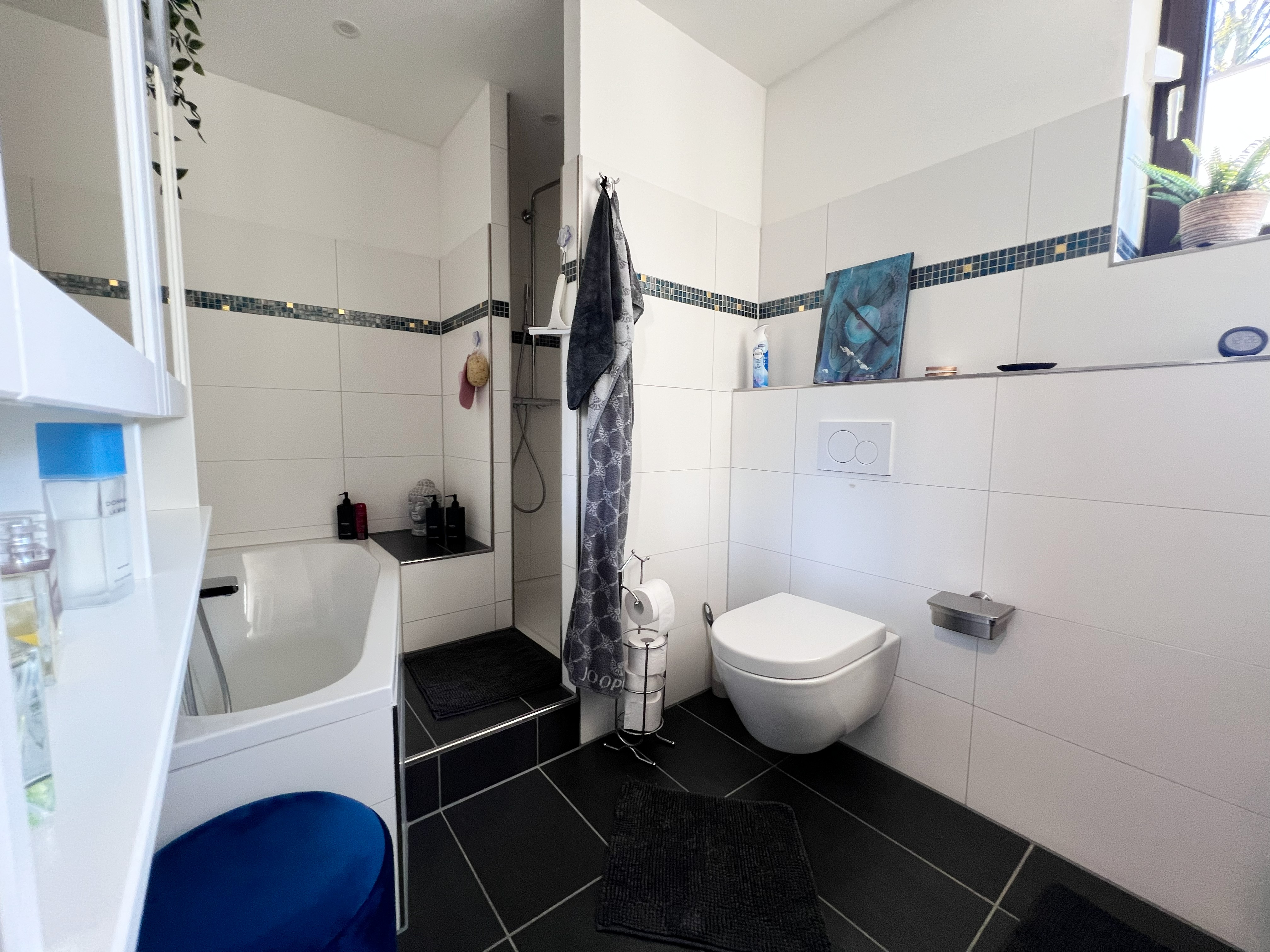 Erdgeschoss: Wohn-/Esszimmer mit Balkon, Küche, Zimmer, Gäste-WC, Diele Untergeschoss: zwei Zimmer, Diele, Bad, Hauswirtschaftsraum, Zugang zum Garten Modernisierung in den letzten 8 Jahren: – Fußbodenheizung; neue Anlagentechnik 2023 – Bodenfliesen; innenliegender Treppenbelag – Fensterscheiben; elektr. betriebene (Alu-) Rolläden – Haustür – Gäste-WC – helles Bad mit Dusche, Wanne, WC, Waschtisch, Fenster – Balkongestaltung (Bodenplatten) – Garten mit Gartenhaus – 2 Terrassen (Beläge, Bepflanzung) – Smart-Home-Nutzung für Rolläden und Kamera – Wall-Box für die beiden Tiefgaragen-Stellplätze