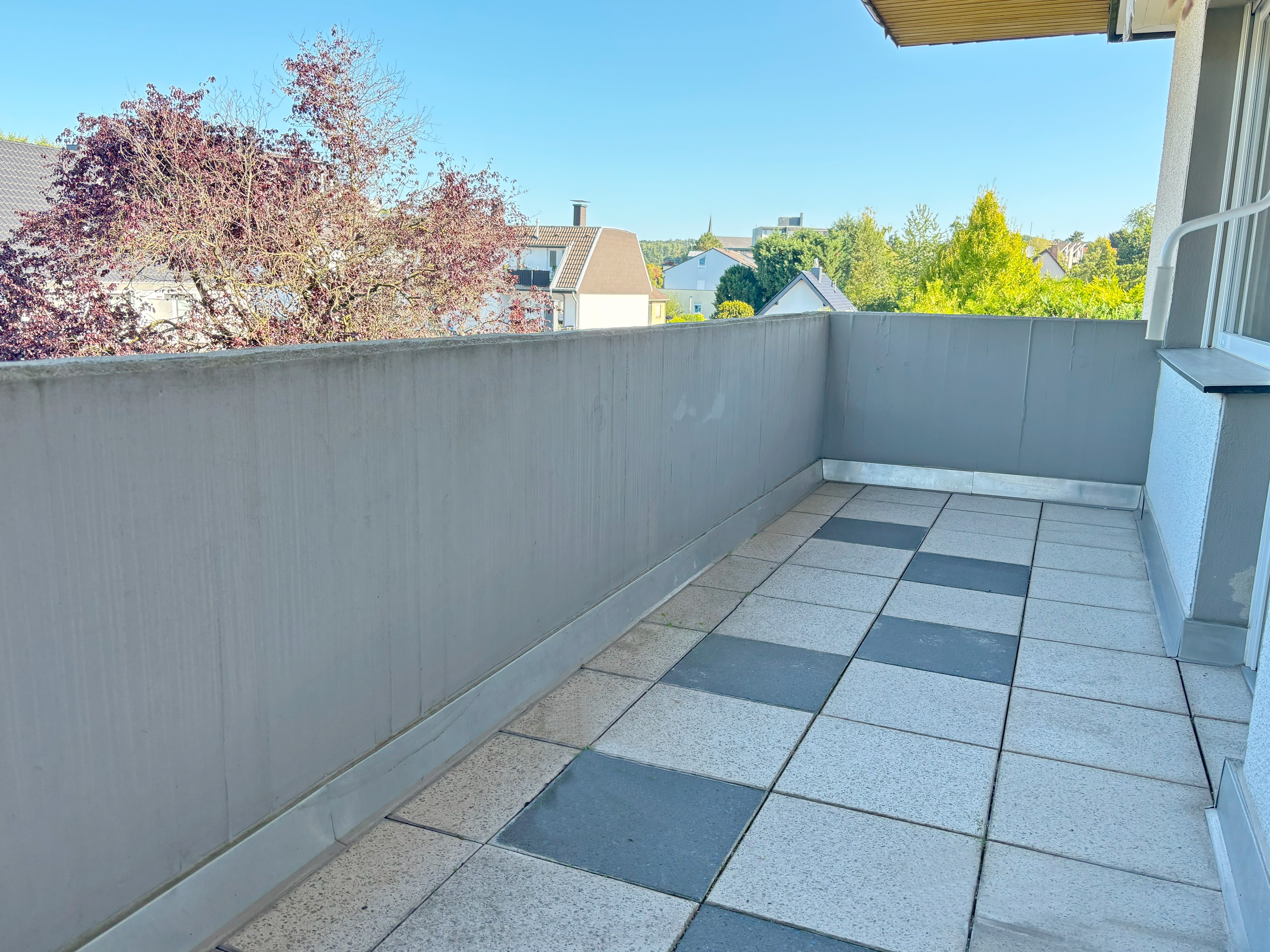 Der überdachte Balkon ist vom Wohn-/Esszimmer und vom Schlafzimmer begehbar.